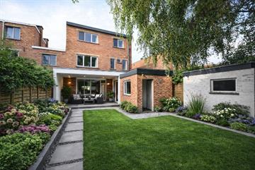 Interessante half vrijstaande burgerwoning van 1945 ontworpen door architect De Brauwer met 3 bouwlagen en plat dak in modernistisch getinte stijl.