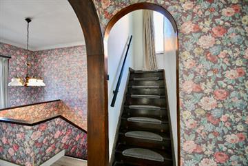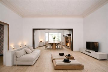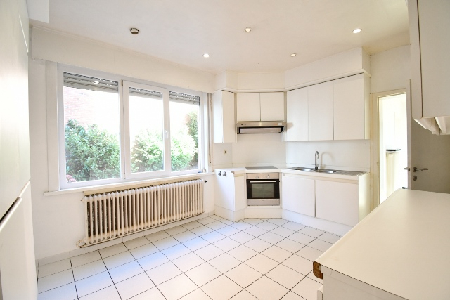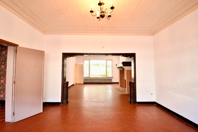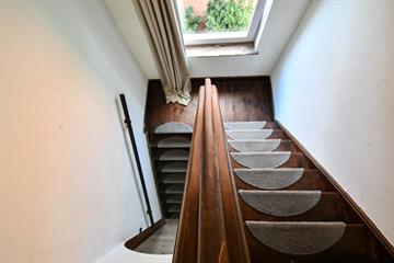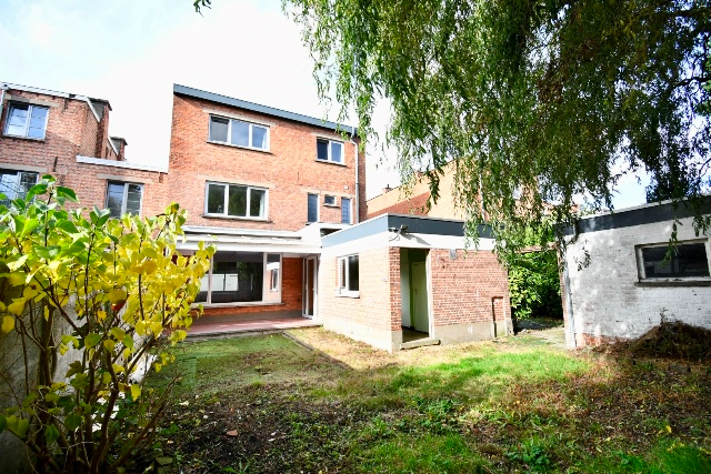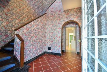 Op het gelijkvloers vinden we de prachtige inkomhall met statige trap naar boven. Vanuit de inkomhall bereikt men de zeer grote living bestaande uit 2 opvolgende delen, samen 47.5 m² met zicht op de (stads)tuin van 68 m². Er is een oprit langs het huis naar de ruime garage (33 m²). Summiere keuken, een apart toilet, doucheruimte en bergingen in de verlenging van het hoofdgebouw. Boven bevinden zich 6 grote slaapkamers (4 van 20 m², 1 van 6 m², 1 van 10.5 m²) en 1 badkamer.
